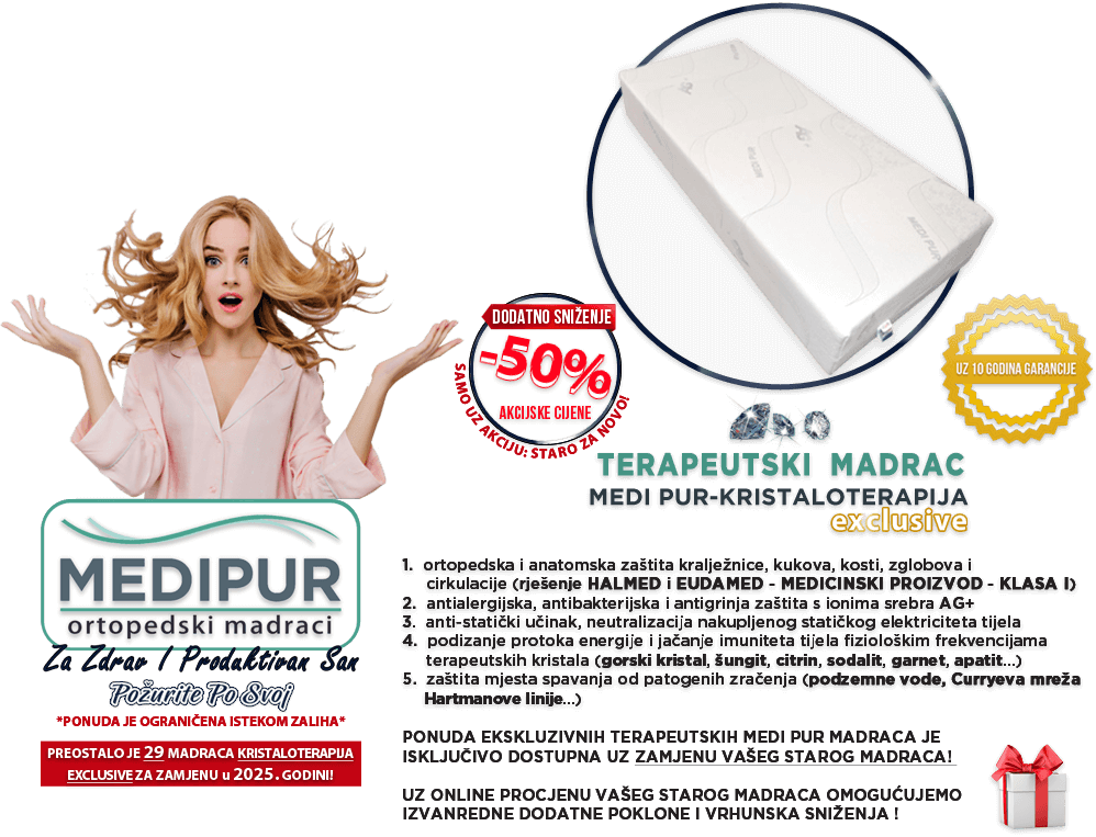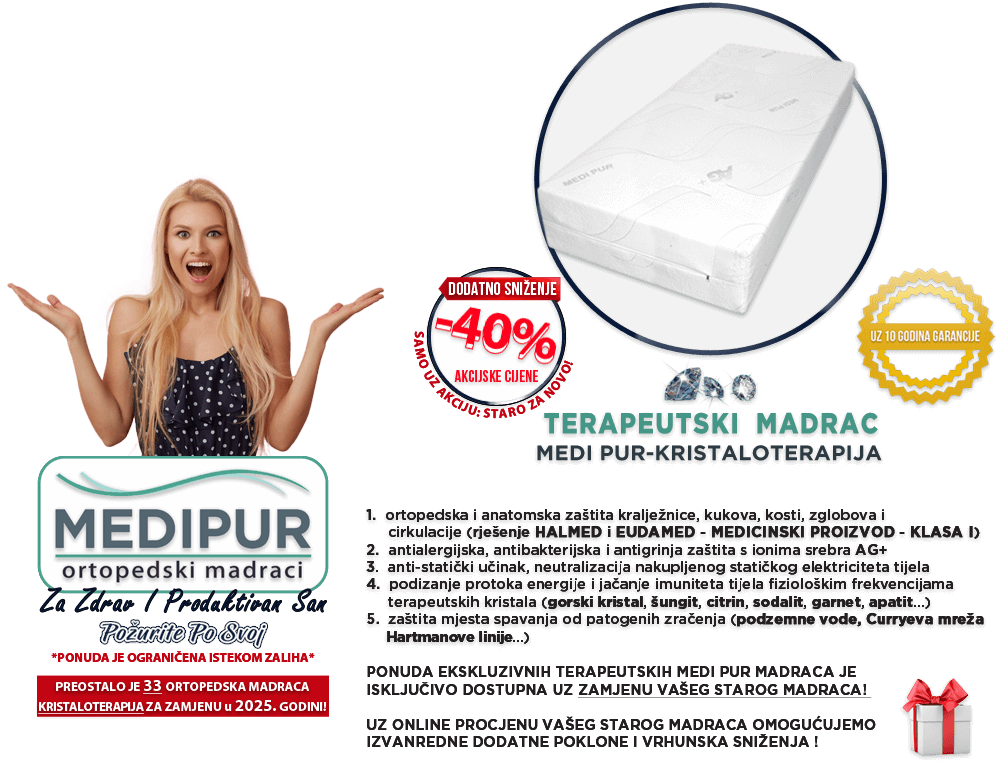 Pošto je kućni budget taj koji često puta ograničava kupovinu visoke kvalitete madraca, mi smo se i tu prilagodili ogromnom broju kupaca na način da smo kreirali 4 MODELA MEDI PUR MADRACA – KRISTALOTERAPIJA EKSCLUSIVE, KRISTALOTERAPIJA, SUPERIOR i ORTO. Na taj način omogućili smo gotovo svakoj obitelji koja traga za vrhunskim madracem koji će potrajati 15 – 25 godina, da u skladu sa svojim financijskim mogućnostima odaberu deklarirani ortopedski madrac iznadprosječne kvalitete, ali sa dodatnih 5 zaštitnih funkcija na Vaše zdravlje. Takav nećete pronaći u prodavaonicama madraca, zato nemojte puno lutati, donesite odluku i iskoristite rok od 30 dana koji Vam omogućujemo za Vaš novi MEDI PUR MADRAC. Imate na raspolaganju kupovinu na 12, 24 ili 36 obroka sa otplatnom ratom već od 200,00 kn mjesečno. Važno je samo odlučiti koji model bi uzeli.