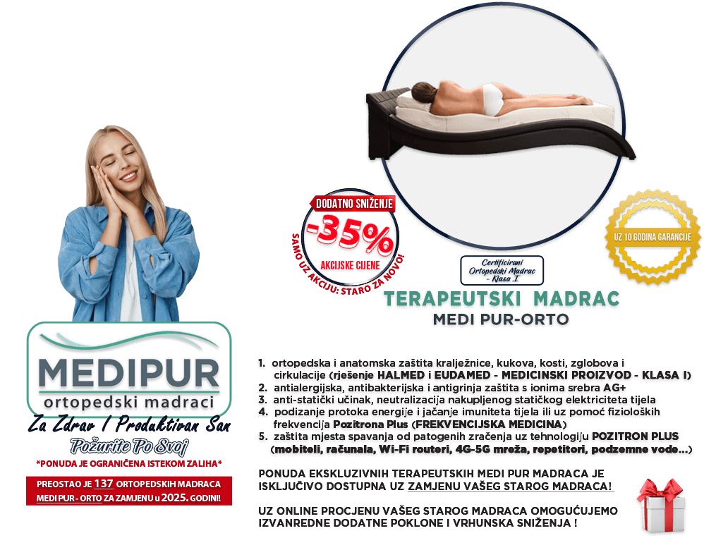 Javite nam se već danas za potpuno besplatnu procjenu vašeg starog madraca i zamjenu za jedan od četiri visokokvalitetna i EKSKLUZIVNA modela MEDI PUR madraca, te provjerite zašto je preko 30,000 naših zadovoljnih kupaca odabralo jedini cjeloviti ortopedski program zdravog spavanja na hrvatskom tržištu sa 5 dokazanih zaštitnih učinaka na ljudsko zdravlje.