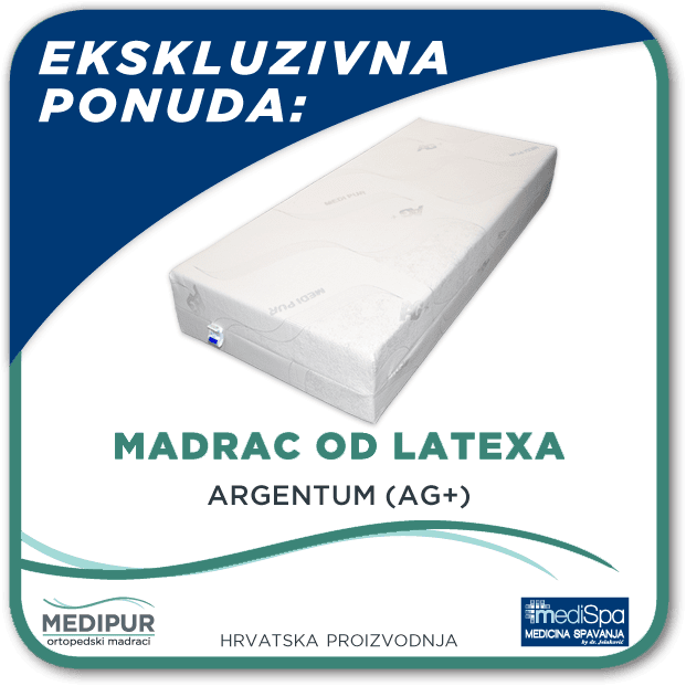 Madrac – LATEX (AG+) proizveden je od najkvalitetnijeg latexa gustoće 75 kg/m3, što predstavlja savršenu gustoću za vrlo udoban san, a uz to 20 cm visine madraca pružiti će vam dodatnu udobnost, jer se vrlo brzo prilagođava novom položaju spavanja svojom elastičnošću – kralježnica će uvijek zauzeti položaj u svojoj  fiziološkoj ravnini što madrac čini ortopedskim, a čitavo tijelo biti će oslobođeno od pritiska o podlogu što omogućuje vrhunsku mikro-cirkulaciju krvi i limfe, te odličnu oksigenaciju organizma. Sve to garantira vrhunski odmor, udoban san, te odličnu noćnu regeneraciju čitavog organizma.