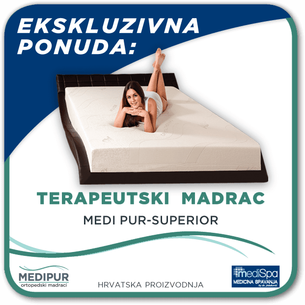 - MADRAC MEDI PUR – SUPERIOR – gornji dio madraca proizveden je od 5 cm TERMO–SENZIBILNOG ORTOPEDSKOG MEDI PUR MATERIJALA, a donji dio madraca građen je od visoko-elastične HLADNO LIJEVANE PJENE (visina madraca može biti 15, 20, 25 ili 30 cm)