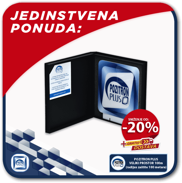 POZITRON PLUS – VELIKI PROSTOR (HOTELI, ZGRADE…) jedinstven je visoko sofisticirani proizvod za preventivnu zaštitu ljudskog zdravlja, proizveden od 6 slojeva višestruko obrađivanog i nano-tehnološki programiranog celuloidnog materijala, koji je u finalnom procesu proizvodnje dodatno zaštićen smoliranim premazom, što mu omogućuje izrazito dugi vijek trajanja (više desetaka godina). Predstavlja mali frekvencijski odašiljač, koji u prostor oko sebe emitira TRI SPEKTRA vlastitih programiranih frekvencija, koje štite ljudsko zdravlje od agresivnih patogenih frekvencija mobitela, laptopa, računala, repetitora i ostalih bežičnih tehnologija, ali i od patogenih zračenja iz prirodnih izvora (podzemni vodeni tok, Hartmanovo i Curryevo zračenje).
